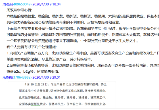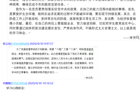 2020年4月30日,总支教工二支部组织全体党员以自主学习+交流讨论形式(平台:学习强国)开展学习“习近平:扎实做好“六稳”工作、落实“六保”任务奋力谱写陕西新时代追赶超越新篇章”精神,并开展讨论交流。