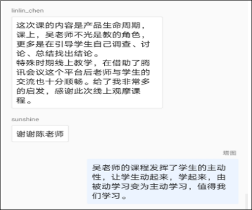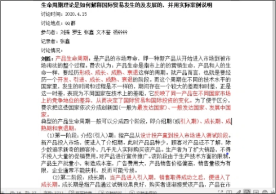 吴文平老师用腾讯会议平台,首先对《国际经济学》课程中的产品生命周期理论进行知识讲解;然后发布案例讨论话题,让员工以小组为单位进行线上讨论;员工讨论后对讨论的结果进行线上发言,其他同学进行线上点评;最后老师进行总结和讲解。吴文平老师围绕产品生命周期理论,以小组为单位,发挥员工主动性,由教师为主导转变为由员工为主导。