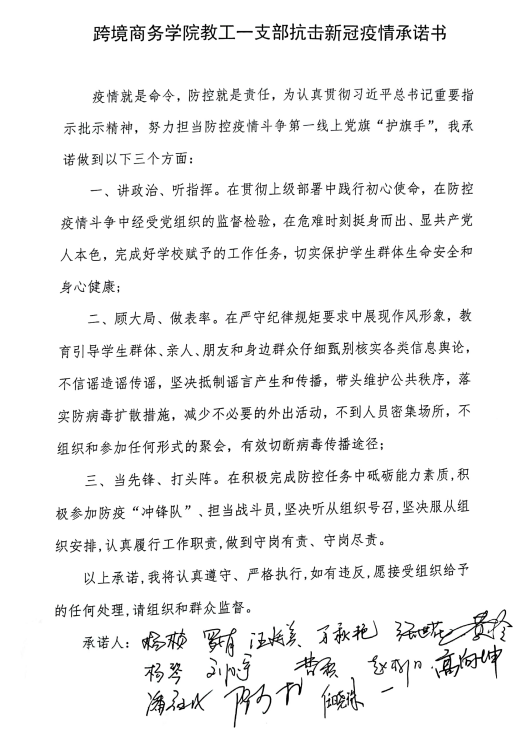 疫情就是命令,防控就是责任,教工一支部党员承诺做到:讲政治、听指挥;顾大局、做表率;当先锋、打头阵,努力担当防控疫情斗争第一线上党旗“护旗手”。
