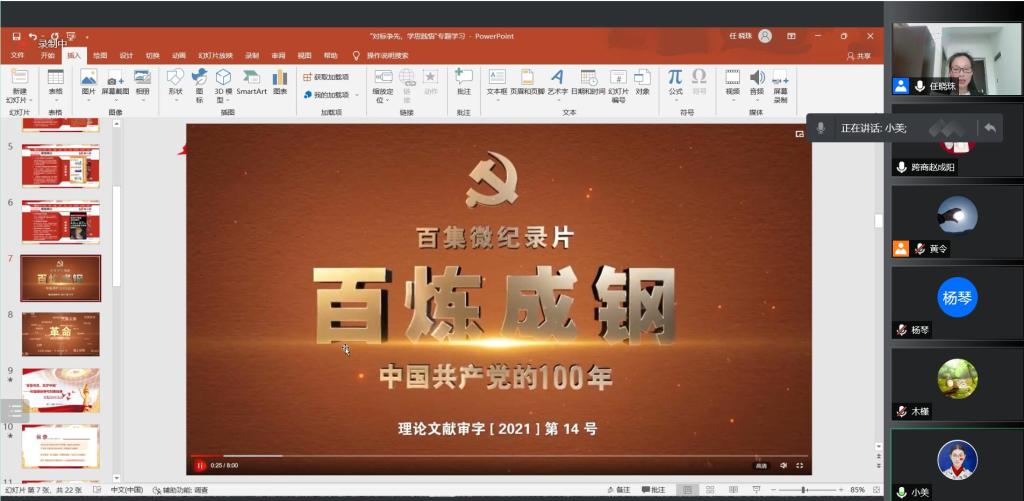 会议上,任晓珠同志号召支部党员观看《百炼成钢》纪录片。该纪录片用100个历史故事展示了中国共产党自成立以来的光辉历程和伟大成就。展现中国共产党人的崇高精神,从而更好发挥党的“以史鉴今、资政育人”作用。