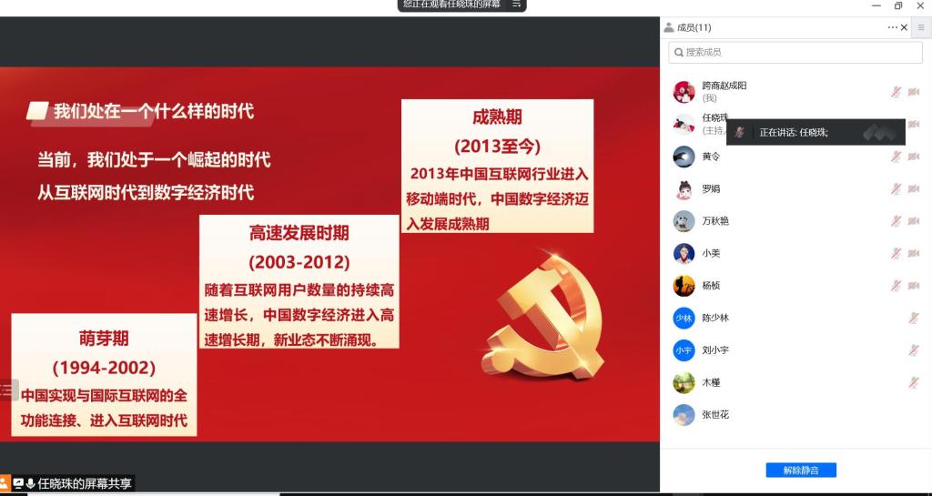 2022年5月19日,教工一支部通过腾讯会议开展了“数字经济时代的青年担当”专题学习会,主要围绕“我们处在一个什么样的时代”,“数字经济时代需要什么样的年轻人”,“新时代青年人有什么样的使命与担当”等内容学习,旨在通过专题学习培养现时代青年教师的责任意识。