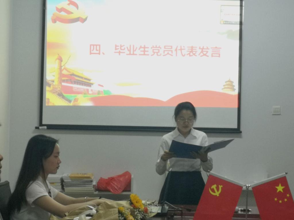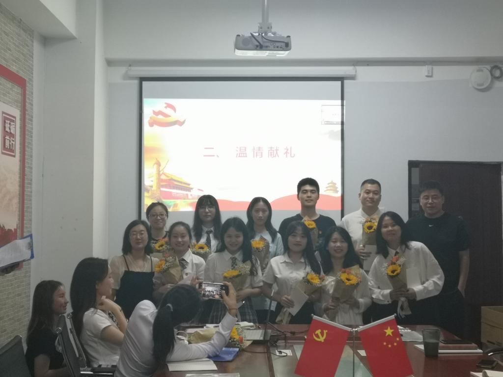 活动伊始,王浩瑞同志进行会议人数清点,宣布到会情况。首先,由预备党员陈香莲同志深情寄语毕业生党员同志,并表示在学长学姐榜样的力量下,会追随党的脚步,接过他们手中的接力棒,奉献自己的力量。其次,由到会的各位教师党员依次给毕业生党员献上鲜花和贺卡并合影留念。随后,毕业生党员张磊同志带领全体与会人员重温入党誓词,要求各位同志不忘初心,牢记使命。接下来,由毕业生党员代表向燕同志发言。字里行间表达了对学校和学院的感恩,表示作为员工党员要永葆初心,承担责任。最后,党总支书记任伟同志总结本次主题党日活动,对顺利完成学业的毕业生党员表示热烈祝贺,同时也对他们提出了殷切的期望和要求,希望他们在今后的人生道路上自信自强、奋勇攀登,创造精彩人生。