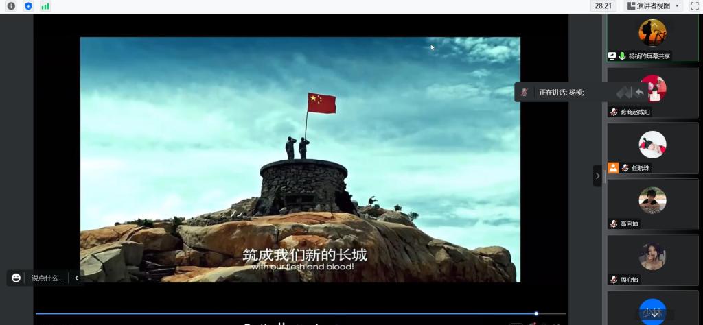 活动中支部副书记杨桢通过腾讯会议组织大家一起观看影片《守岛人》,该影片讲述了一位普通民兵王继才用32年坚守开山岛的故事。