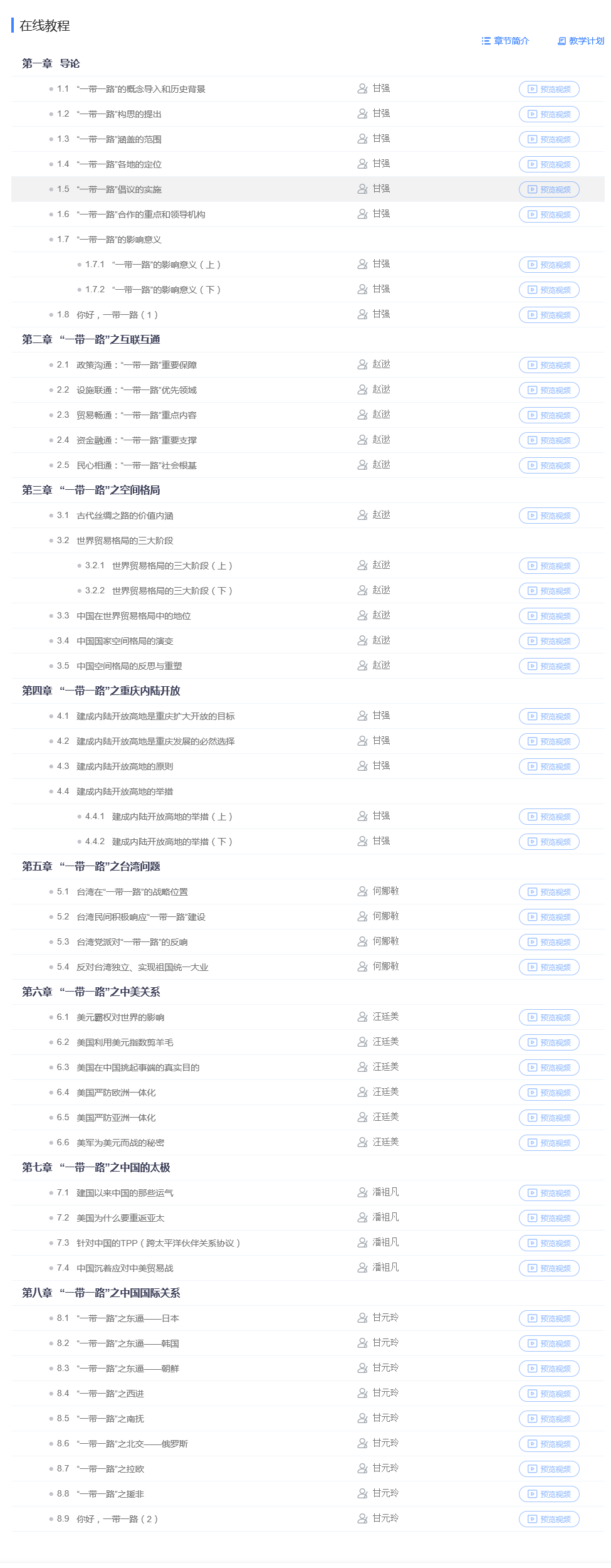 《世界经济地理之一带一路》课程从八个不同的专题,以“世界经济地理视角”解读“一带一路”。八个专题分别为:专题一是导论,从历史背景等8个方面解读“一带一路”;专题二到五是国内部分,分别解读“五通”、空间格局、重庆内陆开放、台湾地区参与“一带一路”建设;专题六到八是国际部分,解读中美和中国周边东南西北的国际关系。