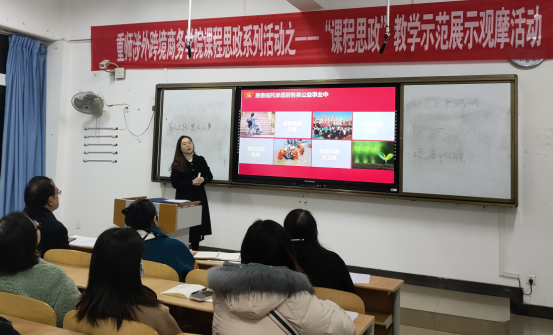 本次示范观摩活动以系为单位同步举行,跨境电商系在7202教室由系主任甘元玲老师主持;商务经济系在7203教室由系主任汪廷美老师主持;金融工程系在7204教室由系主任徐洪志老师主持。学院全体党政领导、教职员工和员工代表共计200余人参加了本次活动。