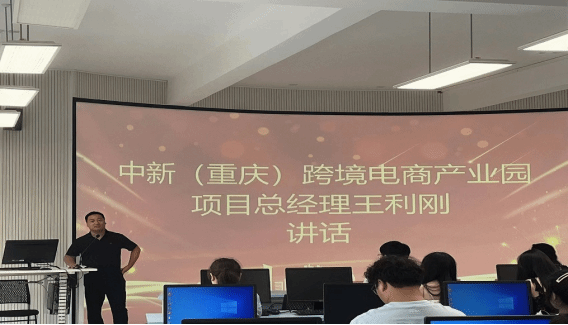 随后,中新(重庆)跨境电商产业园项目总经理王利刚先生上台,详细介绍了项目的背景、目标及具体要求。他强调了跨境电商行业的快速发展和人才需求的紧迫性,并指出本次研修班将结合理论与实践,为师生们提供全方位、多角度的学习体验。他还表示,中新(重庆)跨境电商产业园将为研修班提供丰富的实践机会和资源支持,确保研修班取得圆满成功。