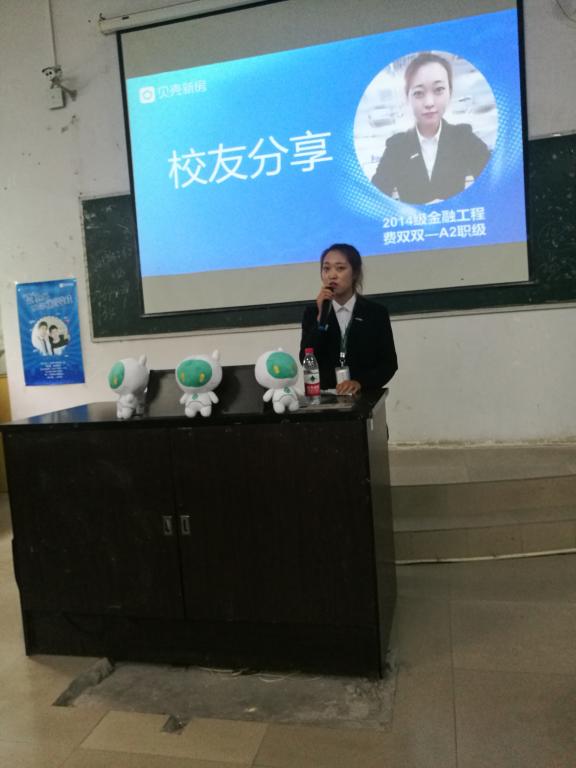 主持人致开场词、介绍莅临现场嘉宾后,重庆链家房地产经纪有限公司人力资源校招组主管张珂先生就企业文化、企业发展、优秀后备人才班开办模式等向到会师生做了详细介绍。随后, 2018届金融工程专业毕业员工费双双,作为重庆链在职优秀家员工同时也作为母校优秀毕业生,向到会的学弟学妹们分享了自己的工作心得和成长感悟。
