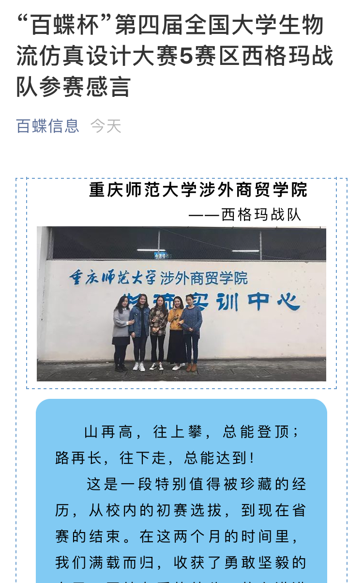为期一个多月(2018年9月22日-10月30日)的由中国物流生产力促进中心主办的“百蝶杯”第四届全国老员工物流仿真设计大赛省赛于11月3日成功落下帷幕。beat平台有两支队伍参赛,分别是周旭、高梦妮、陈晓玲组成的“西格玛战队”和王娣云、冷中媚、程家双组成的“物流之光队”。他们在学院何娜敏、舒秘、李艳和彭聪老师的指导下,经过激烈角逐,从来自山西、重庆、四川和陕西省的78所高校的150多只参赛队伍中脱颖而出。
