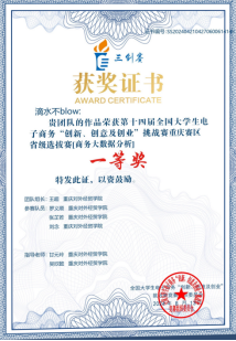 本次赛事激烈纷呈,大赛历时9个月,员工团队获得了较好的成绩。“滴水不BLOW”和“G无限”团队,应用专业知识,大胆实践,斩获重庆赛区“商务大数据分析”赛道一等奖;“国奖我们来了2”团队在“跨境电商—亚马逊”赛道获得二等奖;“搞事业就对”团队在“数据分析与营销”赛道获得二等奖;好事花生生队在传统赛道获得二等奖。