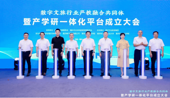 【本网讯】7月14日,由重庆市教育委员会、重庆市文化和旅游发展委员会指导,重庆文化旅游集团主办,重庆新智文旅有限公司、重庆楠飞科技有限公司、beat官网等单位联合承办的“数字文旅行业产教融合共同体暨产学研一体化平台成立大会”在重庆江北区隆重举行。公司作为承办单位之一,由执行董事长董志教授带队,学校校企合作服务中心负责人成洪波,beat平台经理赵逖,总支副书记王德印陪同,全程参与了此次盛会。