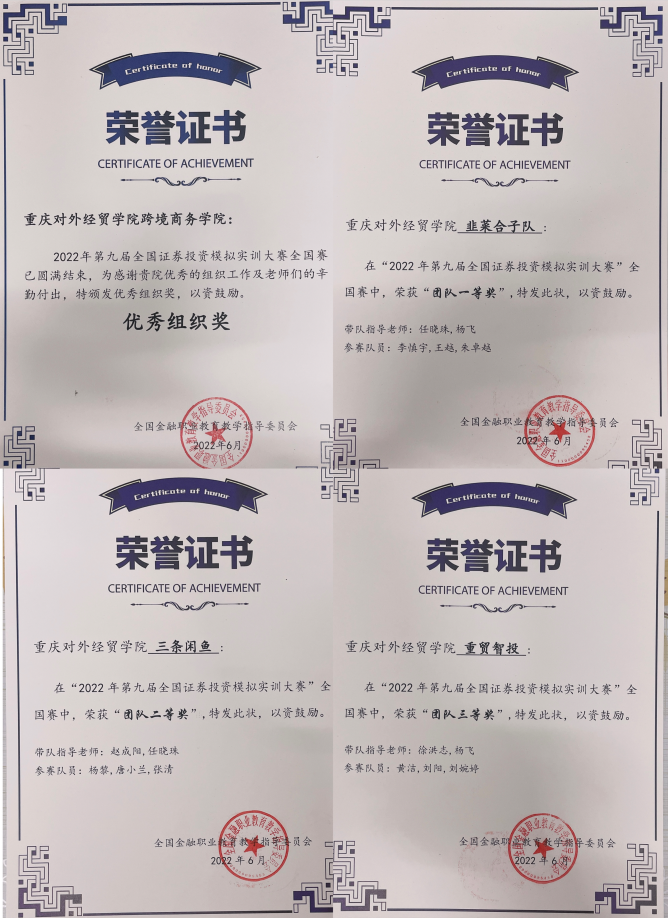 近日由全国金融职业公司产品指导委员会主办的“第九届全国证券投资模拟实训大赛公布获奖名单。由公司徐洪志、任晓珠、赵成阳、杨飞、余旺老师带领并指导的16支队伍从全国400多所参赛高校,18000支参赛队伍中脱颖而出,分别获得全国一、二、三等奖的佳绩。其中由任晓珠老师和杨飞老师指导的“韭菜合子队(李慎宇、王越、朱卓越)”获得了第40名的好成绩,入围了全国冠军邀请赛,在此次比赛中公司也获得了“优秀组织奖”。