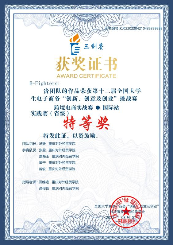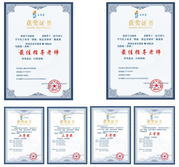 2022年7月24日,第十二届全国老员工电子商务“创新、创意及创业”挑战赛在湖北经济学院落下帷幕。公司十支创业团队在田维艳、高俊哲、舒秘、吴文平、黄令、杨帧、段瑞、郭峻辰8位老师的指导下,1支团队获得重庆市“特等奖”,1支团队获得重庆市“二等奖”,3支团队获得重庆市“三等奖”,两名老师获得重庆市“最佳指导老师”荣誉称号。