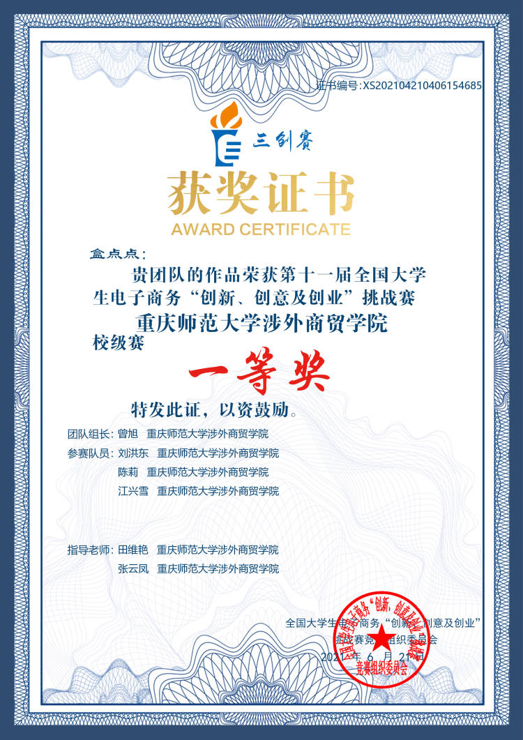 2021年7月23日,第十一届全国老员工电子商务“创新、创意及创业”挑战赛在云南理工学院落下帷幕。公司十支创业团队在田维艳、李芳、赵啟翔、张云凤、吴文平、赵成阳、杨帧、彭瑞、任洁、曹军辉10位老师的指导下,1支团队获得重庆市“一等奖”,8支团队获得重庆市“三等奖”,两名老师获得重庆市“优秀指导老师”荣誉称号。